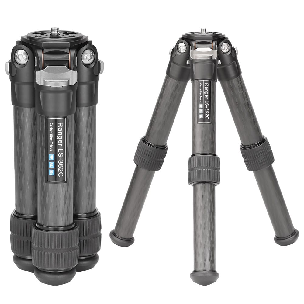 Das LS-362C Stativ hat eine maximale Arbeitshöhe von 35 cm ohne Kugelkopf. Zusammengeklappt ist dieses Stativ jedoch nur 26 Zentimeter lang und die minimale Arbeitshöhe beträgt 6,5 Zentimeter. Trotz des geringen Gewichts von nur 1,1 Kilogramm hat dieses Ranger-Stativ eine Tragfähigkeit von 45 Kilogramm! Das Stativ wird mit einer Tragetasche, einem Multitool und Spikes geliefert. Eine passende Mittelsäule und ein Kugelkopf sind separat erhältlich.