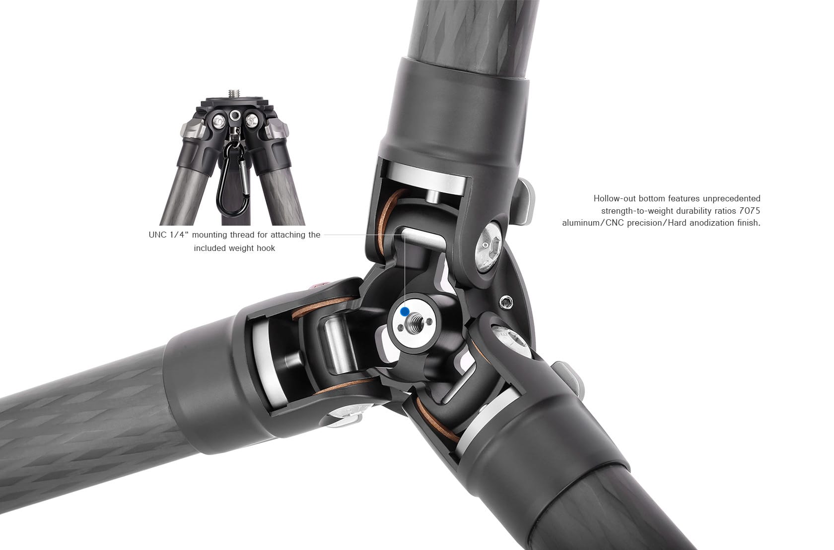 Die Beine des LS-362C sind mit dem Twist-Lock-System ausgestattet, sodass das Stativ blitzschnell ein- und ausgeklappt werden kann. Sie können die mitgelieferten Spikes einfach unter das Stativ schrauben. An der Seite und Unterseite der Mittelplatte des Stativs befindet sich 1/4 Zoll Schraubengewinde zur Befestigung von Zubehör wie Magic Arms oder Taschen für zusätzliche Stabilität.