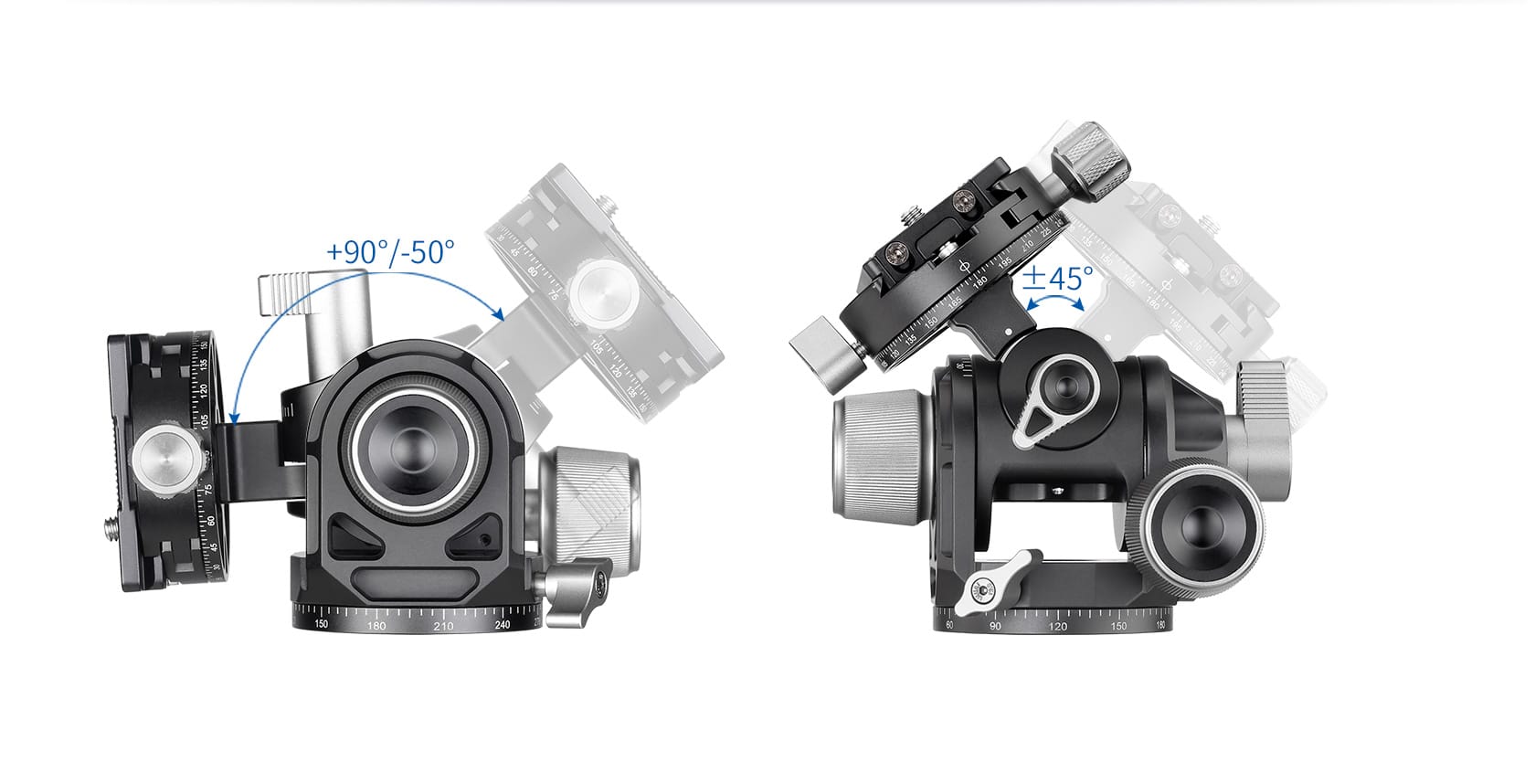 Der 3-Achsen Getriebeneigekopf mit doppelter Panoramafunktion. Beide Schwenkachsen (X und Y) können über den Hebel ohne Getriebeübersetzung blitzschnell in Position gebracht werden. Wird der Hebel fixiert, kann zusätzlich über die grössere Drehschraube für jede Achse eine hochpräzise Feinjustierung der Kamera eingestellt werden. Dies erübrigt das zeitintensive schrauben zur groben Positionierung der Kamera. Die praktische Schnellwechselplatte NP-60 sowie die integrierte Wasserwaage runden das Erlebnis ab.