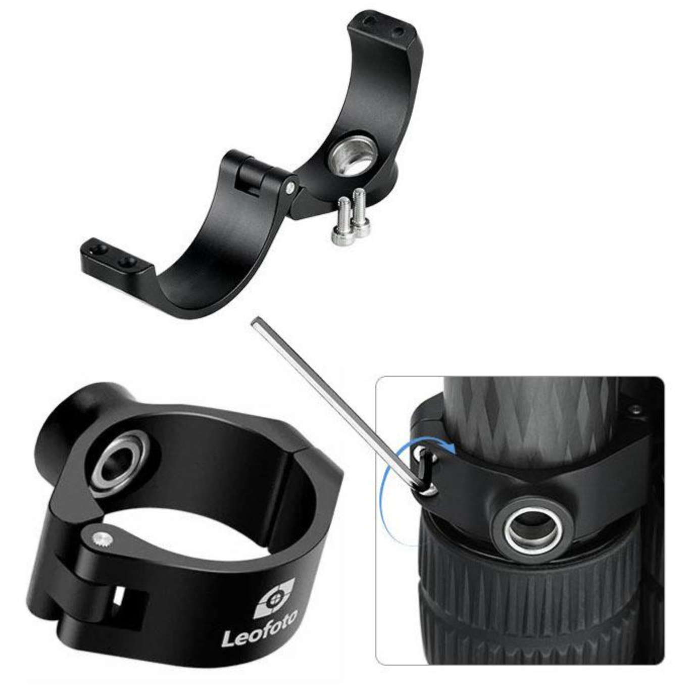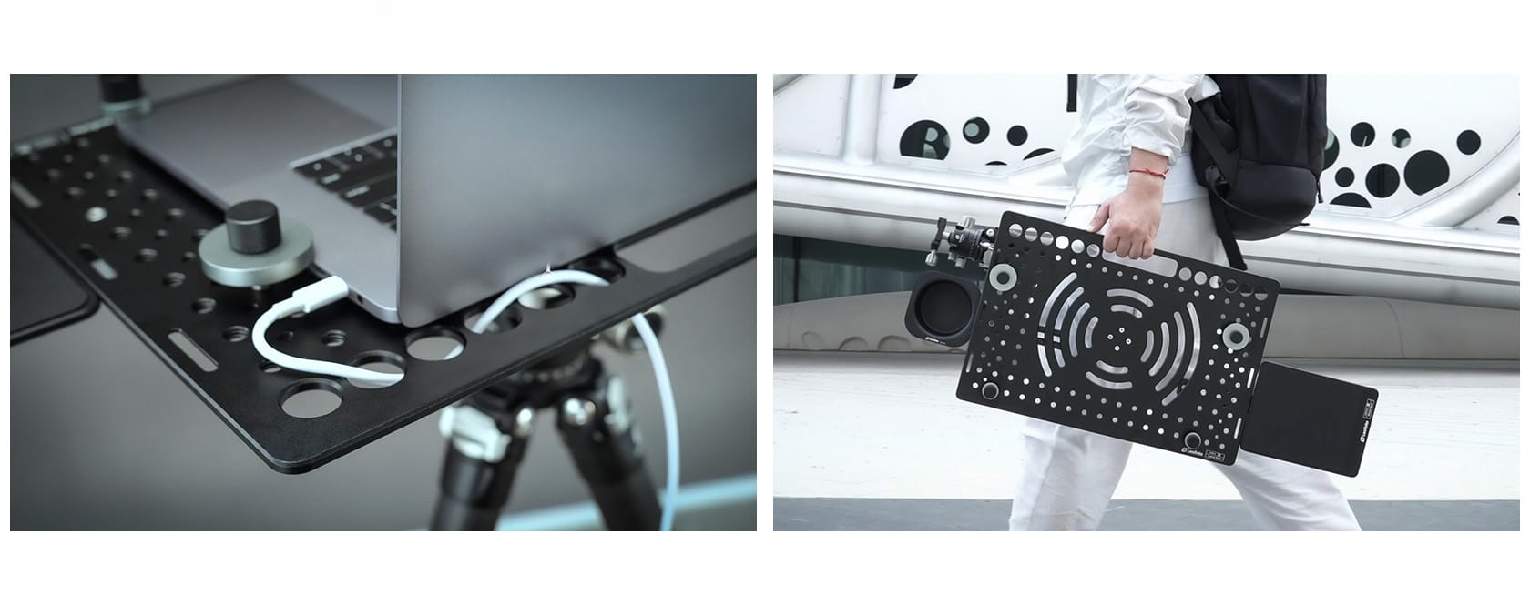 Die Notebook-Halterung kann per 3/8 Zoll Schraube direkt auf einem Stativ oder Lampenstativ montiert werden oder mit einem Stativkopf per Arca-Swiss-Kupplung. Der kompatible Cupholder und das Mousepad sind als separates Zubehör erhältlich.