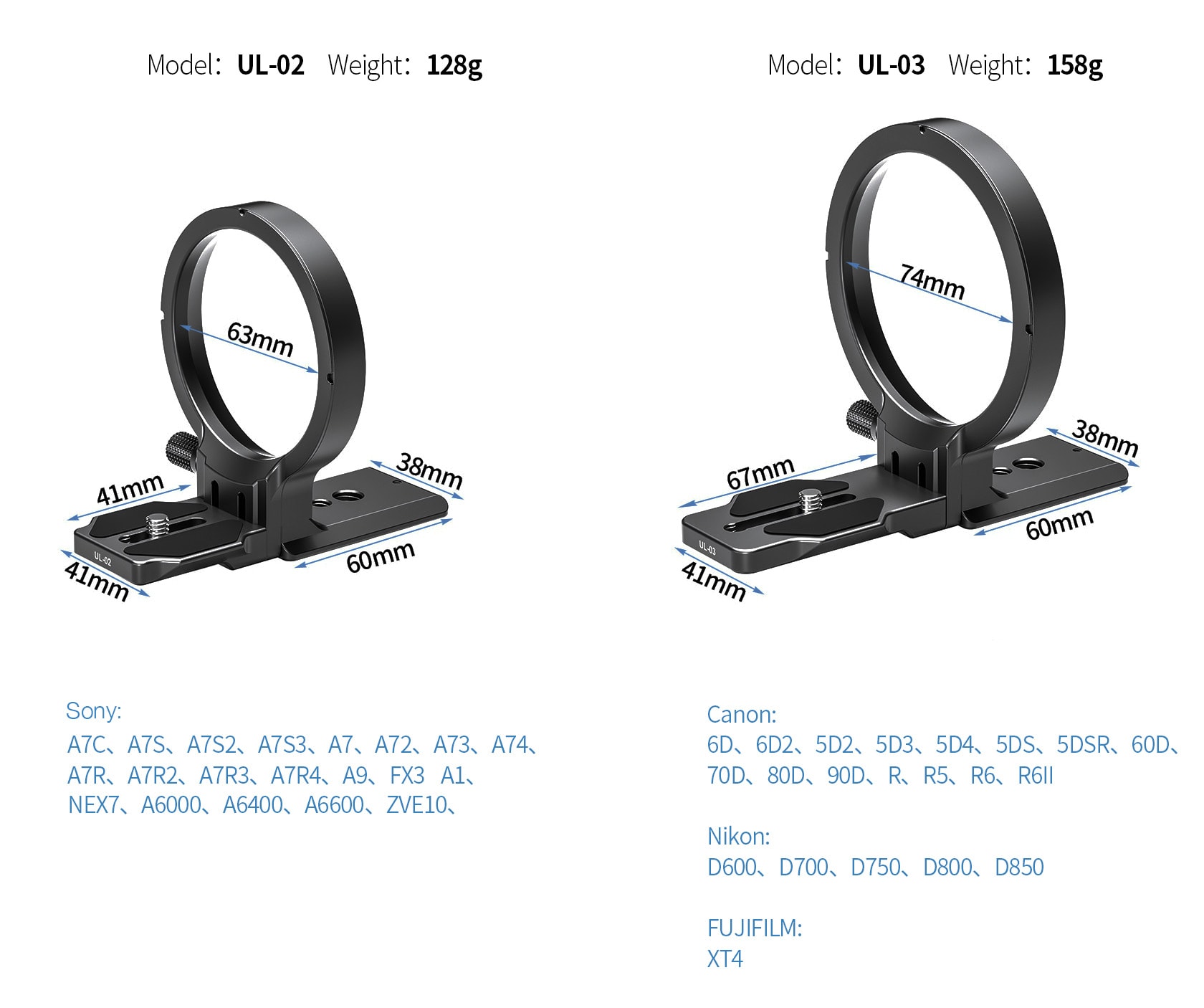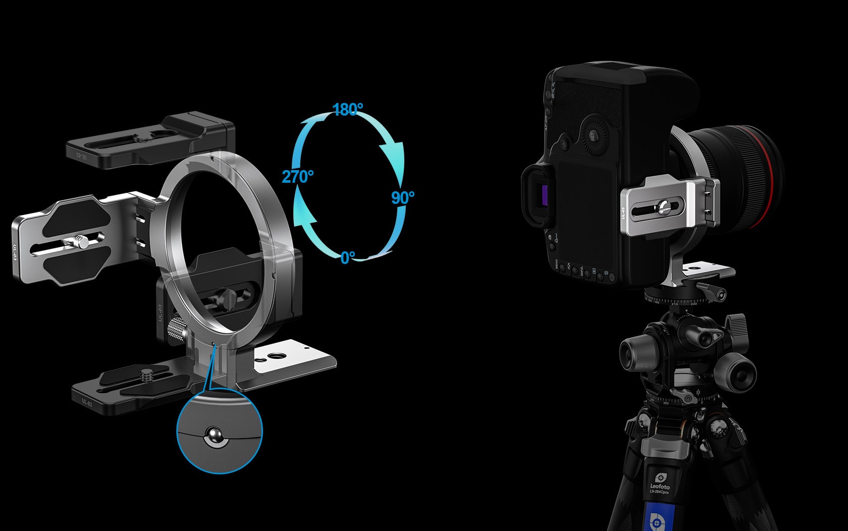 Die Leofoto UL-02 ermöglichen es dem Benutzer, mühelos zwischen Quer- und Hochformat beidseitig zu wechseln. Die Halterung ist mit Präzisionslagern ausgestattet und kann in vier verschiedenen 90° Positionen eingestellt werden, ohne dass eine Demontage erforderlich ist. Die drehbaren Halterungen der UL-Serie bestehen aus hart eloxiertem Flugzeugaluminium. Die Höhe ist um bis zu 12mm verstellbar. Der Schwerpunkt ist ausgemittet und man kann schnell vom Hoch- ins Querformat wechseln, ohne das Stativ komplett neu auszurichten. Ideal auch für die Panoramafotografie für die justierung des Nodalpunktes. Die Objektivschelle UL-02 ist für Objektive mit einem maximalen Durchmesser von 63mm geeignet. Der Stativfuss ist kompatibel mit allen gängigen Arca-Swiss-Kupplungen.