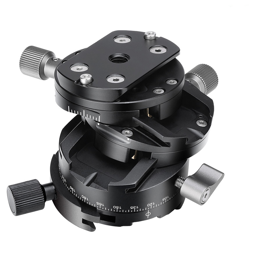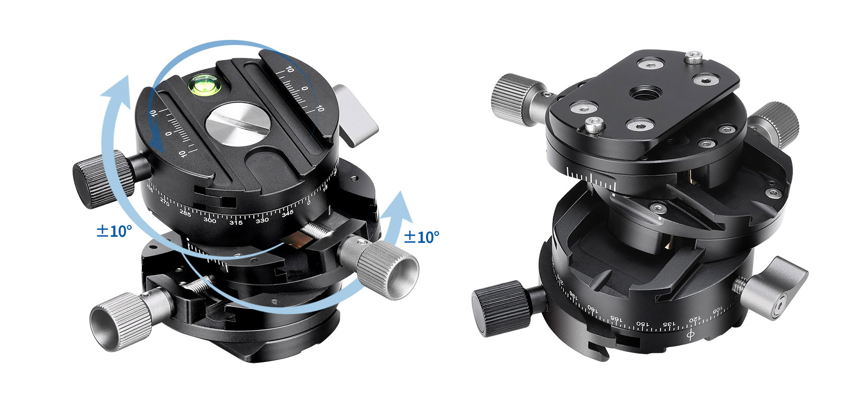 Der G2 Leveler ist ein wahres Talent wenn es um Präzision und Panoramafotografie geht. Mittels Getriebe lassen sich die beiden Achsen vom Multifunktionskopf hochpräzise einstellen. Durch die Neigungswinkel von ±10° in jede Richtung ist eine horizontale Panorama-Ausrichtung der Kamera in Schräglage möglich, ohne den Schwerpunkt zu verlagern.