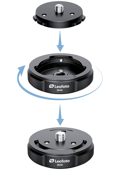 Q60 ist der passende Schnellwechselteller zum QS-60 Wechselsystem. Mittels Bayonett-Verschluss wird das Wechseln von Stativköpfen, Mittelsäulen etc. auf dem Stativ zum Blitzakt. Durch eine einfache Drehbewegung wird die Schnellwechselplatte mit der Halterung QS-60 verschraubt. Die Basis des Q60-Satzes kann an jeder 3/8 Zoll Schraube montiert werden. Drei Schrauben verhindern ein versehentliches Verdrehen. Die Wechselplatte hat einen Durchmesser von 42mm.