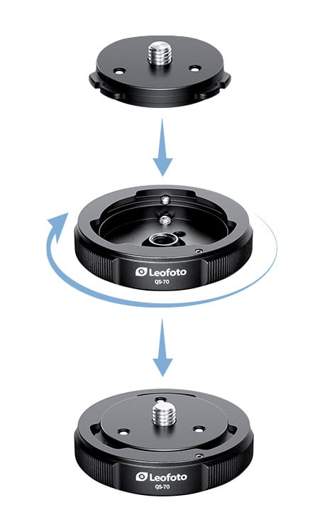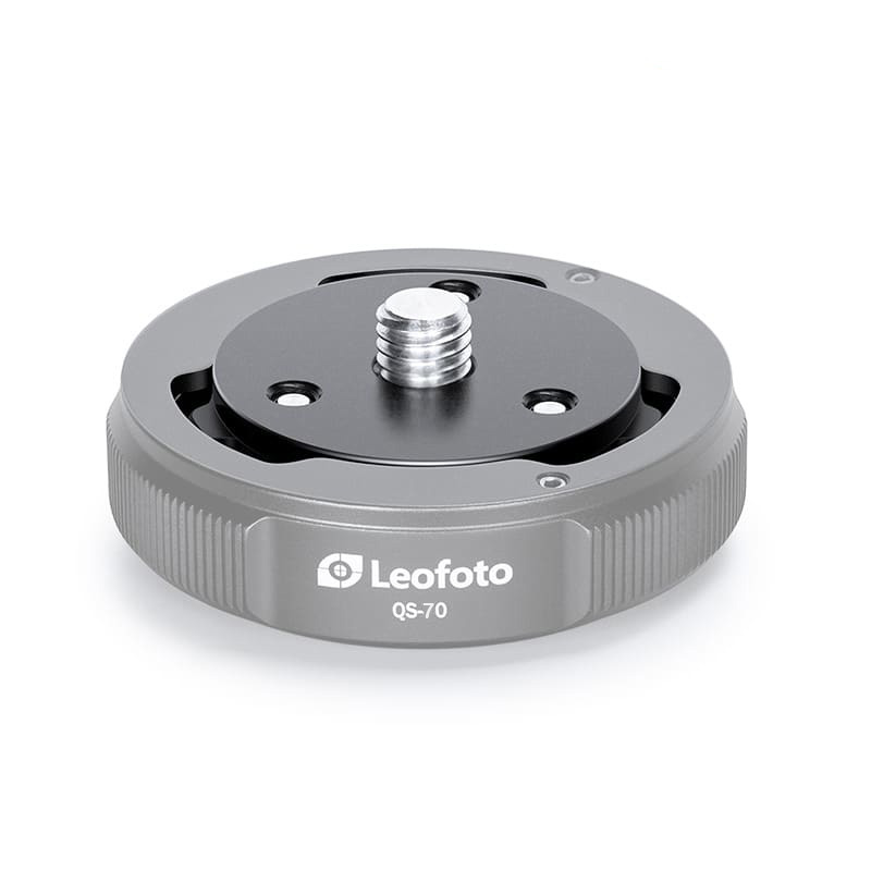 Q70 ist der passende Schnellwechselteller zum QS-70 Wechselsystem. Mittels Bayonett-Verschluss wird das Wechseln von Stativköpfen, Mittelsäulen etc. auf dem Stativ zum Blitzakt. Durch eine einfache Drehbewegung wird die Schnellwechselplatte mit der Halterung QS-70 verschraubt. Die Basis des Q70-Satzes kann an jeder 3/8 Zoll Schraube montiert werden. Drei Schrauben verhindern ein versehentliches Verdrehen. Die Wechselplatte hat einen Durchmesser von 52mm.