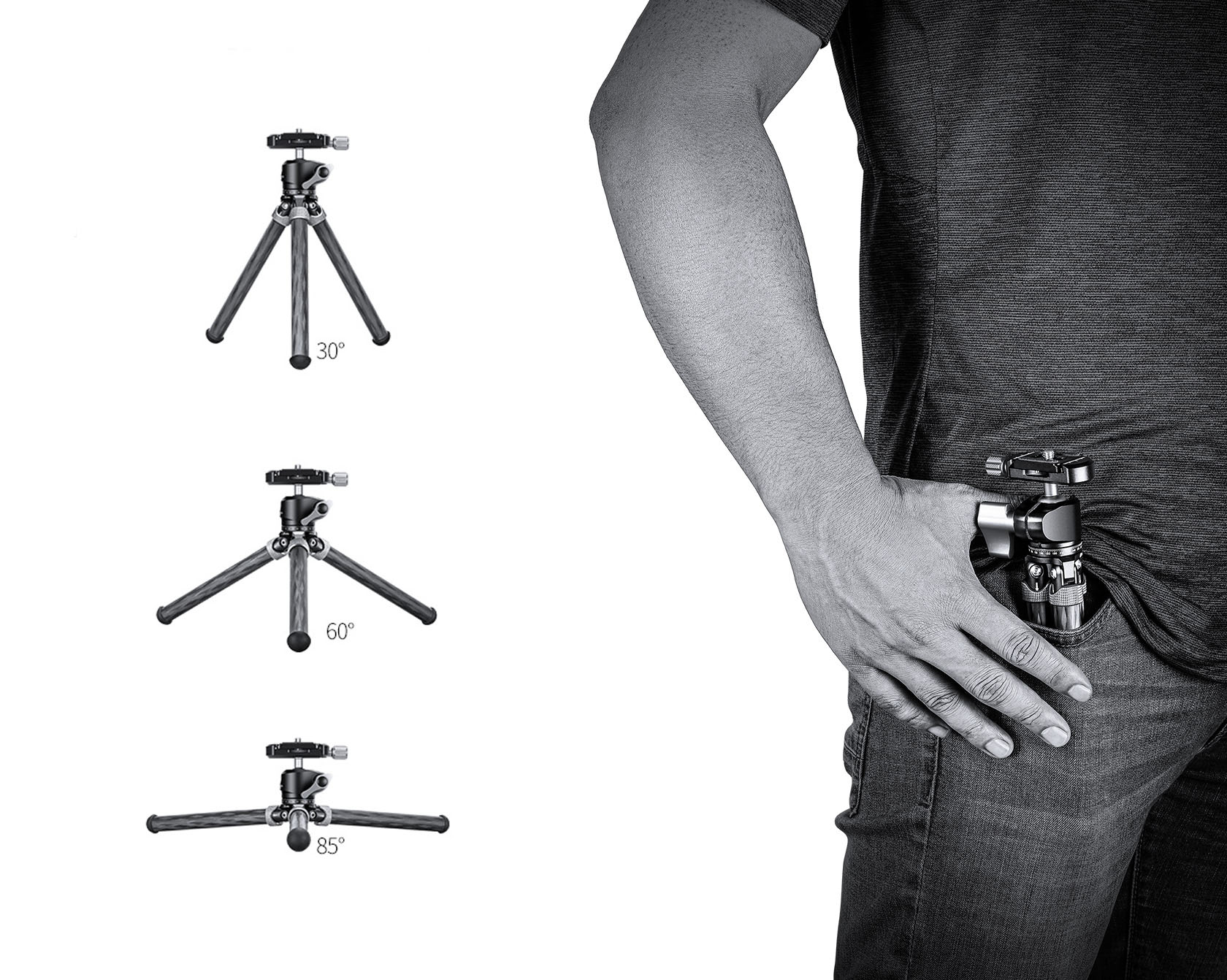 Das leichte Kleinstativ aus Carbon trägt ein stolzes Gewicht von bis zu 5kg – dies reicht aus, um auch grössere Kameras inkl. Objektiv tu stemmen. Mit 17cm Packmass und einem Gewicht von lediglich 108g eignet sich das MT-02C in Hosentaschenformat ausgezeichnet auf Reisen oder Tischstativ für Mikrofone, Smartphones, Blitze, usw.